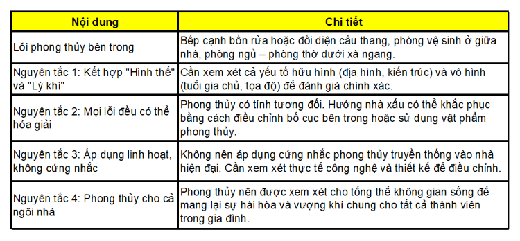 Phong thủy truyền thống được hình thành từ kinh nghiệm sống của cha ông ta trong những điều kiện xã hội và công nghệ xưa. Vì vậy, không phải mọi nguyên tắc xưa đều phải áp dụng cứng nhắc cho nhà hiện đại. Bản chất của phong thủy là linh hoạt, cần được điều chỉnh và thích nghi với sự phát triển của môi trường sống.