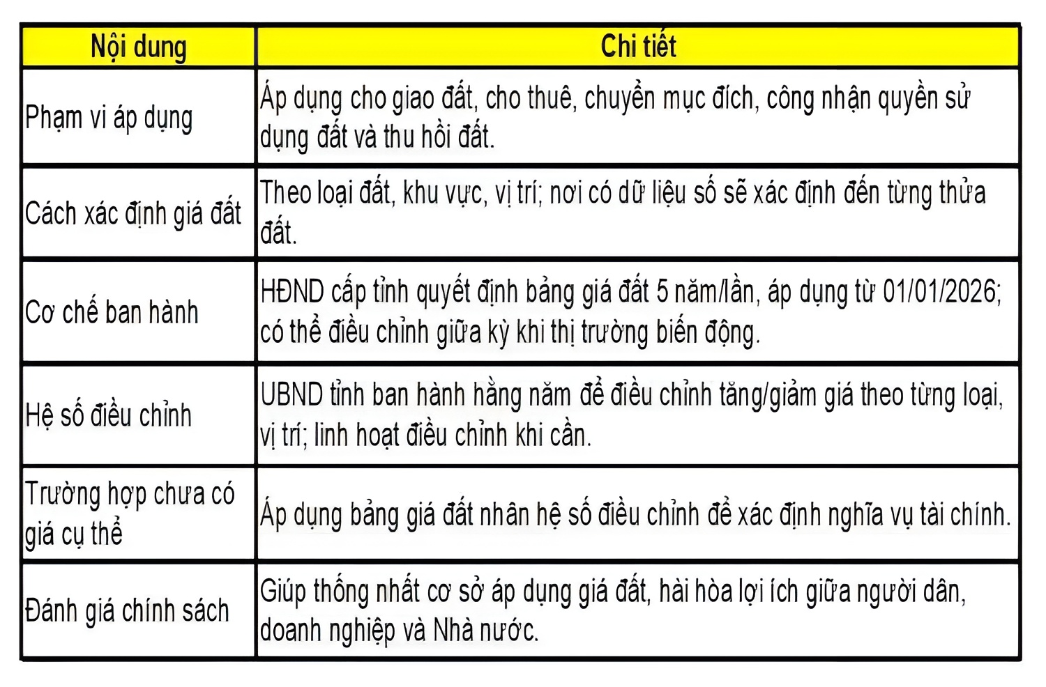 Về mặt kỹ thuật, bảng giá đất sẽ được xác định theo loại đất, khu vực và vị trí. Đặc biệt, tại những khu vực đã có bản đồ địa chính số và cơ sở dữ liệu giá đất, bảng giá có thể được xác định chi tiết đến từng thửa đất, qua đó nâng cao tính chính xác và minh bạch trong định giá.