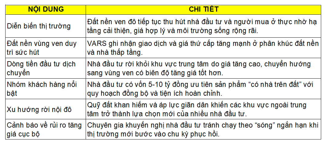 Các chuyên gia nhận định thị trường vùng ven đang thu hút cả nhà đầu tư lẫn người mua ở thực nhờ hạ tầng cải thiện, mức giá hợp lý và không gian sống rộng rãi. Số liệu từ Hội Môi giới Bất động sản Việt Nam (VARS) cho thấy lượng giao dịch và giá bán trên thị trường thứ cấp đối với nhà thấp tầng và đất nền đều tăng mạnh, đặc biệt tại các khu vực ven đô. Một số căn biệt thự, liền kề bỏ trống nhiều năm cũng được rao bán với giá tăng 30%, thậm chí gấp đôi so với năm 2023.