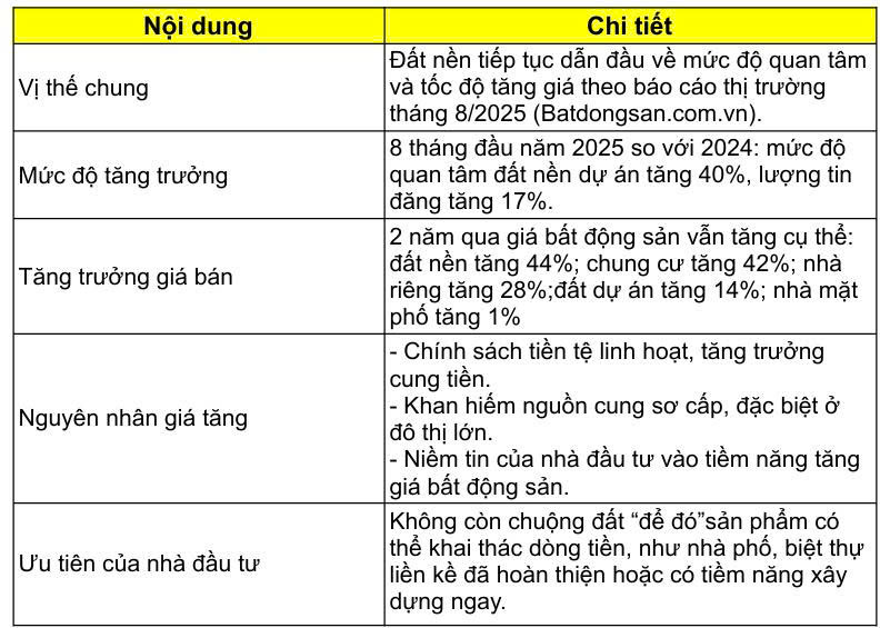 Trong 8 tháng đầu năm 2025 so với cùng kỳ 2024, đất nền dự án ghi nhận tăng trưởng mạnh nhất, với mức độ quan tâm tăng 40% và lượng tin đăng tăng 17%. Trong 2 năm qua, giá bất động sản toàn quốc vẫn giữ đà tăng, nổi bật nhất là đất nền tăng 44% so với quý I/2024, tiếp theo là chung cư tăng 42%. Nhà riêng, đất dự án và nhà mặt phố lần lượt tăng 28%, 14% và 1%