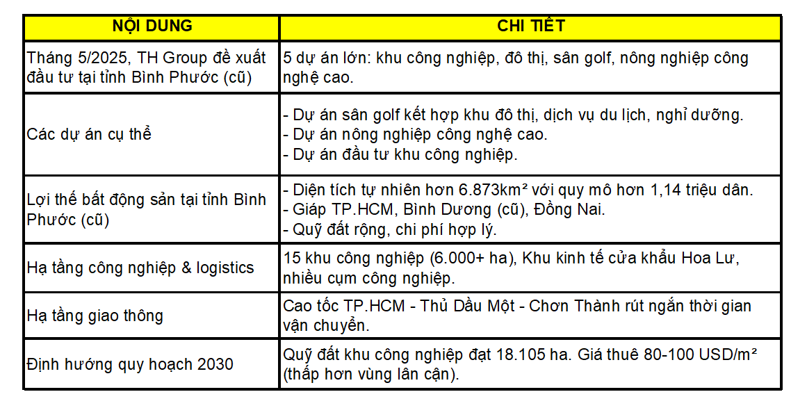 Tháng 5/2025, tập đoàn TH đề xuất đầu tư một tổ hợp quy mô lớn tại tỉnh Bình Phước (cũ). Động thái này cho thấy sức hút ngày càng lớn của khu vực này nhờ lợi thế quỹ đất rộng, vị trí chiến lược và hạ tầng kết nối liên vùng đang được đẩy mạnh.