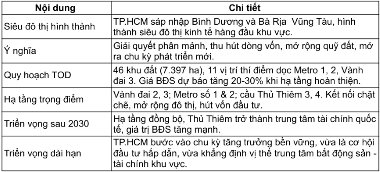 Sự hợp nhất địa giới, chính sách quy hoạch đồng bộ và hạ tầng hiện đại đã và đang đưa TP Hồ Chí Minh trở thành siêu đô thị kinh tế mới, định hình lại thị trường bất động sản phía Nam. Với nền tảng vững chắc và triển vọng dài hạn, TP Hồ Chí Minh hứa hẹn bước vào chu kỳ tăng trưởng bền vững, vừa mở ra cơ hội đầu tư hấp dẫn, vừa khẳng định vị thế là trung tâm tài chính - bất động sản hàng đầu khu vực.