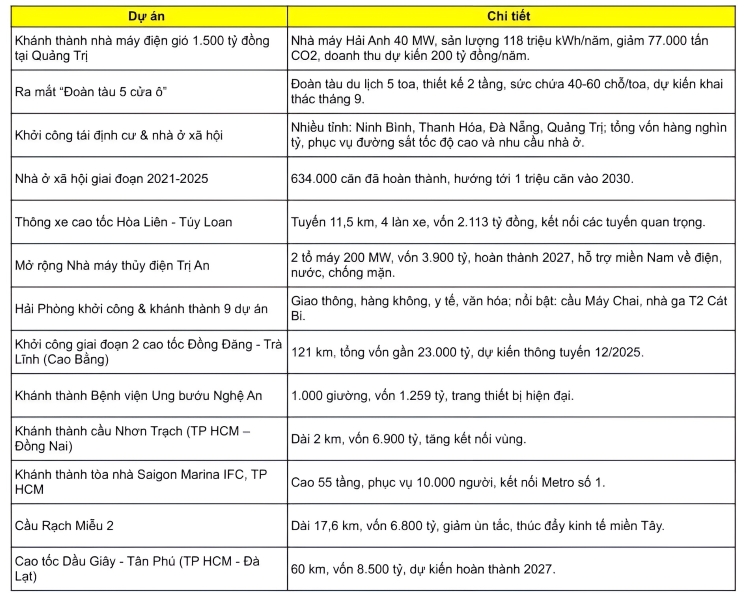 Theo Thứ trưởng Xây dựng Lê Anh Tuấn, tổng 250 công trình có tổng mức đầu tư khoảng 1,28 triệu tỷ đồng, trong đó 89 dự án khánh thành, 161 công trình khởi công. Các dự án gồm 59 công trình giao thông, 44 công trình dân dụng, 57 công nghiệp, 36 hạ tầng kỹ thuật, 22 nhà ở xã hội. Nguồn vốn gồm 478.000 tỷ đồng nhà nước, 802.000 tỷ đồng vốn ngoài nhà nước và 54.000 tỷ FDI.