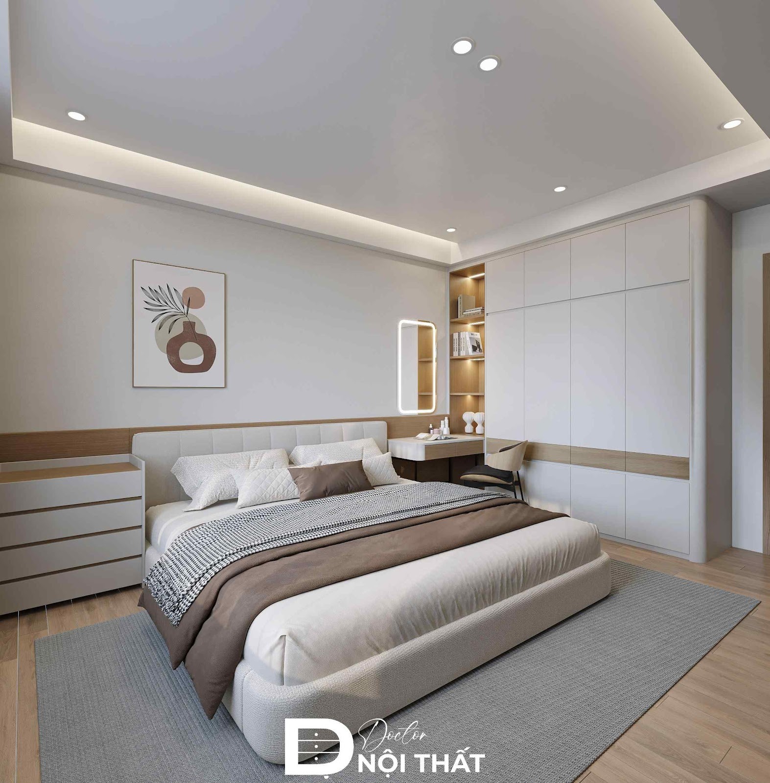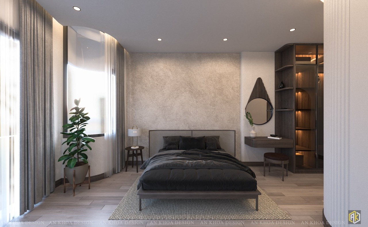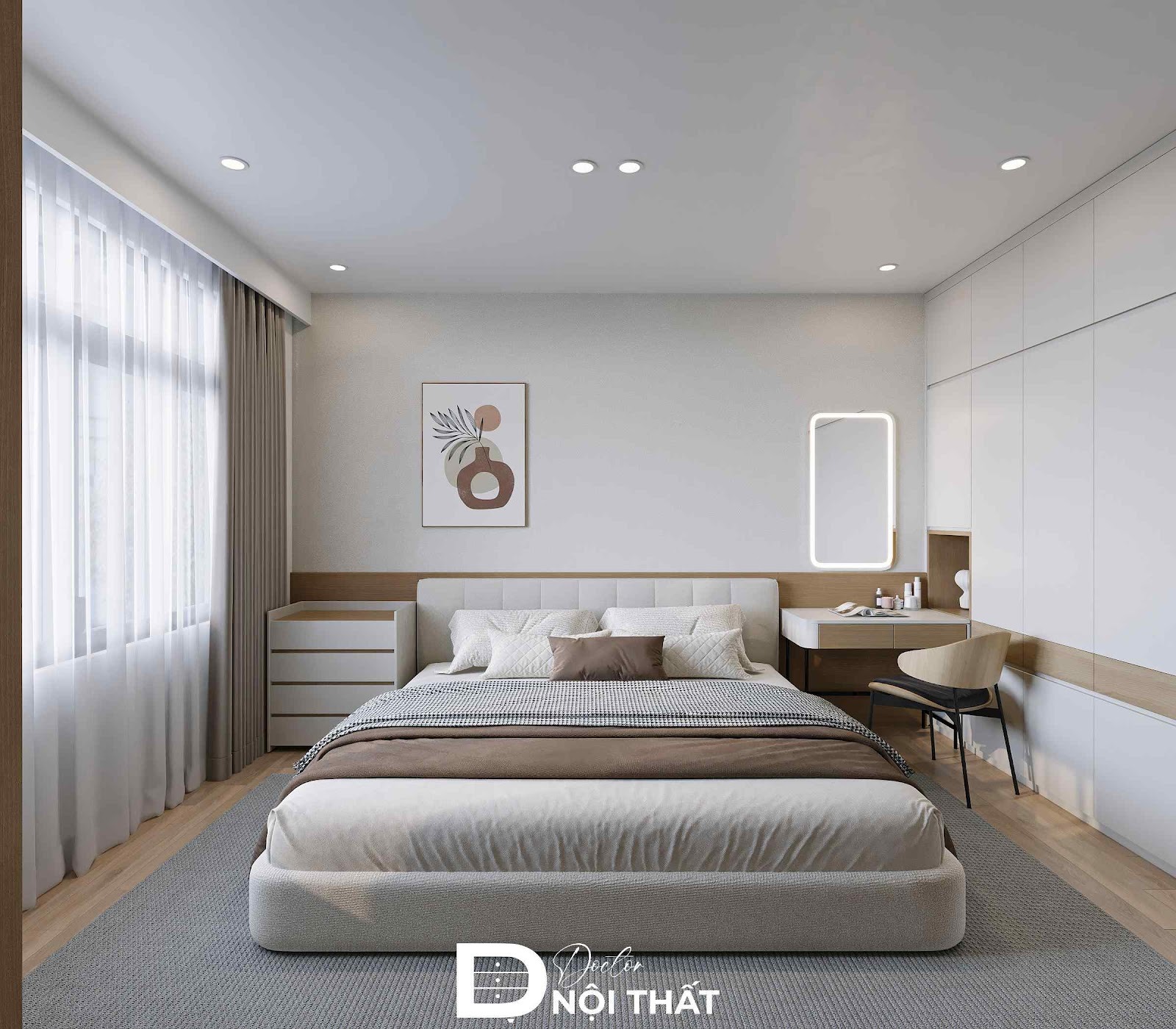 Thiết kế phòng ngủ hiện đại tối giản tạo ấn tượng với gam màu trung tính chủ đạo, kết hợp chất liệu gỗ tự nhiên mang lại cảm giác ấm áp và sang trọng. Giường ngủ kiểu dáng thấp cùng các đường nét nội thất tinh gọn giúp không gian trở nên thông thoáng và hài hòa. Cửa sổ lớn đón ánh sáng tự nhiên, kết hợp cùng rèm vải nhẹ nhàng giúp điều tiết độ sáng linh hoạt, mang lại sự thư giãn tuyệt đối. Góc bàn trang điểm thiết kế âm tường khéo léo, vừa tiết kiệm diện tích vừa đảm bảo tính thẩm mỹ, tạo nên tổng thể phòng ngủ tiện nghi và hiện đại.