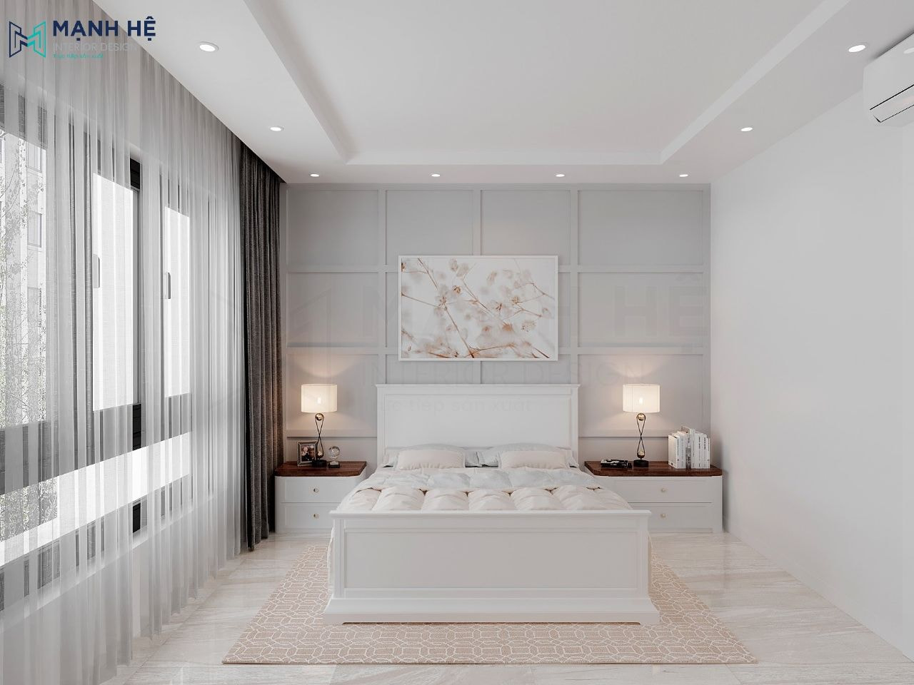 Phòng ngủ master mang phong cách hiện đại tối giản, sử dụng gam trắng chủ đạo tạo cảm giác thanh thoát và tinh tế. Giường ngủ đặt trung tâm, hướng ra cửa sổ lớn đón trọn ánh sáng tự nhiên và gió trời. Hai tab đầu giường cân đối cùng đèn ngủ ánh vàng mang lại sự ấm cúng, hài hòa. Bức tranh nghệ thuật và thảm tông trung tính góp phần hoàn thiện vẻ sang trọng, nhã nhặn - phù hợp cho không gian nhà phố hiện đại, đề cao sự tiện nghi và thư giãn.
