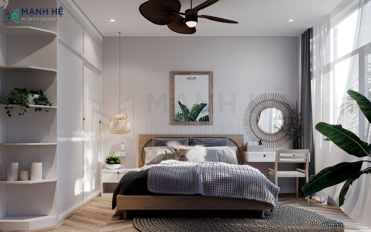 Phòng ngủ mang phong cách Indochine là sự kết hợp tinh tế giữa nét Á Đông truyền thống và hơi thở hiện đại. Chất liệu gỗ tự nhiên, mây tre đan và tông màu nâu ấm được phối hợp hài hòa, tạo nên không gian thư giãn và yên bình. Giường ngủ bố trí gần cửa sổ lớn giúp tận dụng ánh sáng tự nhiên, đồng thời kết nối con người với thiên nhiên xanh mát bên ngoài. Các chi tiết trang trí như quạt trần lá, gương khung mây và tranh treo tường chủ đề “Nature” góp phần tôn lên vẻ mộc mạc nhưng sang trọng - phù hợp cho nhà ống cần không gian nghỉ ngơi thoáng, đậm chất Đông Dương.