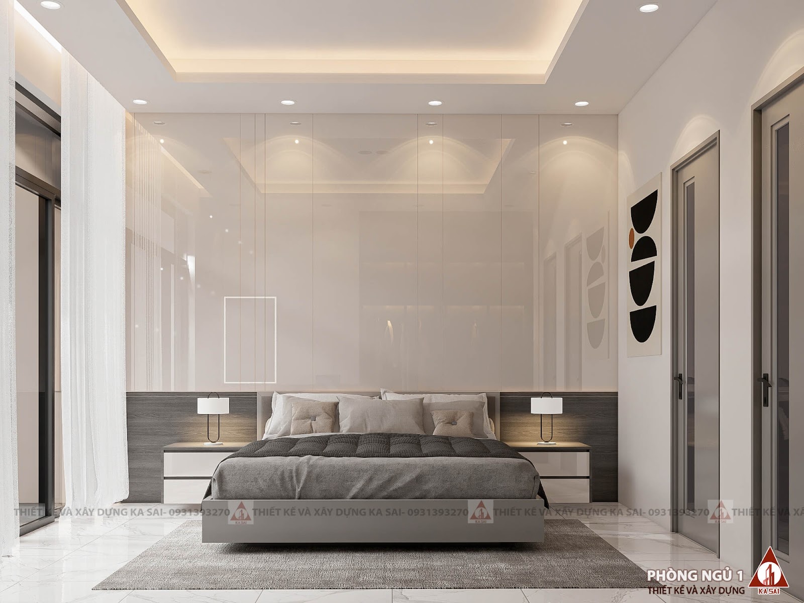 Phòng ngủ hiện đại sang trọng được thiết kế với bảng màu trung tính chủ đạo, kết hợp giữa xám – trắng tinh tế, mang lại cảm giác thanh lịch và thư giãn. Giường ngủ lớn được bố trí đối xứng cùng hai tab đầu giường và đèn ngủ ánh vàng nhẹ, tạo điểm nhấn ấm áp trong không gian. Bức tường đầu giường ốp phẳng bóng bẩy phản chiếu ánh sáng tinh tế, giúp căn phòng trở nên rộng rãi và thoáng đãng hơn.
