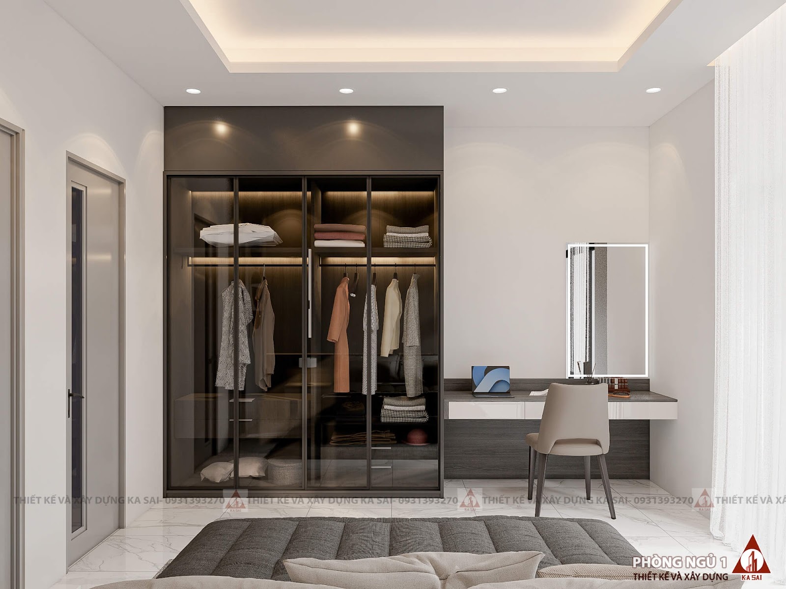 Ngoài ra, không gian lưu trữ và làm việc được bố trí hợp lý, thể hiện sự tiện nghi và thẩm mỹ cao. Tủ quần áo cánh kính tối màu với hệ đèn LED âm tủ tạo cảm giác sang trọng như khách sạn cao cấp. Góc làm việc nhỏ gọn tích hợp bàn trang điểm hiện đại, phù hợp với nhịp sống đô thị. Tổng thể mang lại trải nghiệm nghỉ ngơi và sinh hoạt đẳng cấp, tinh tế trong từng chi tiết.