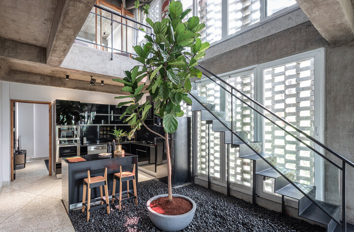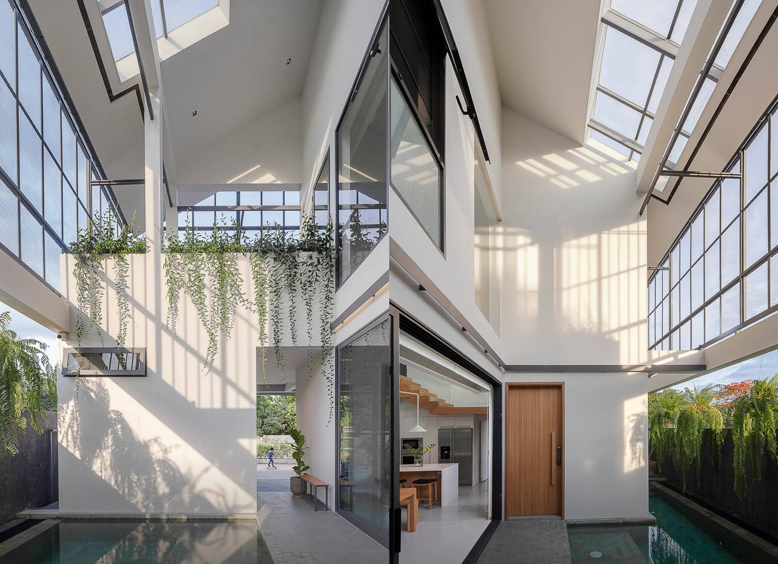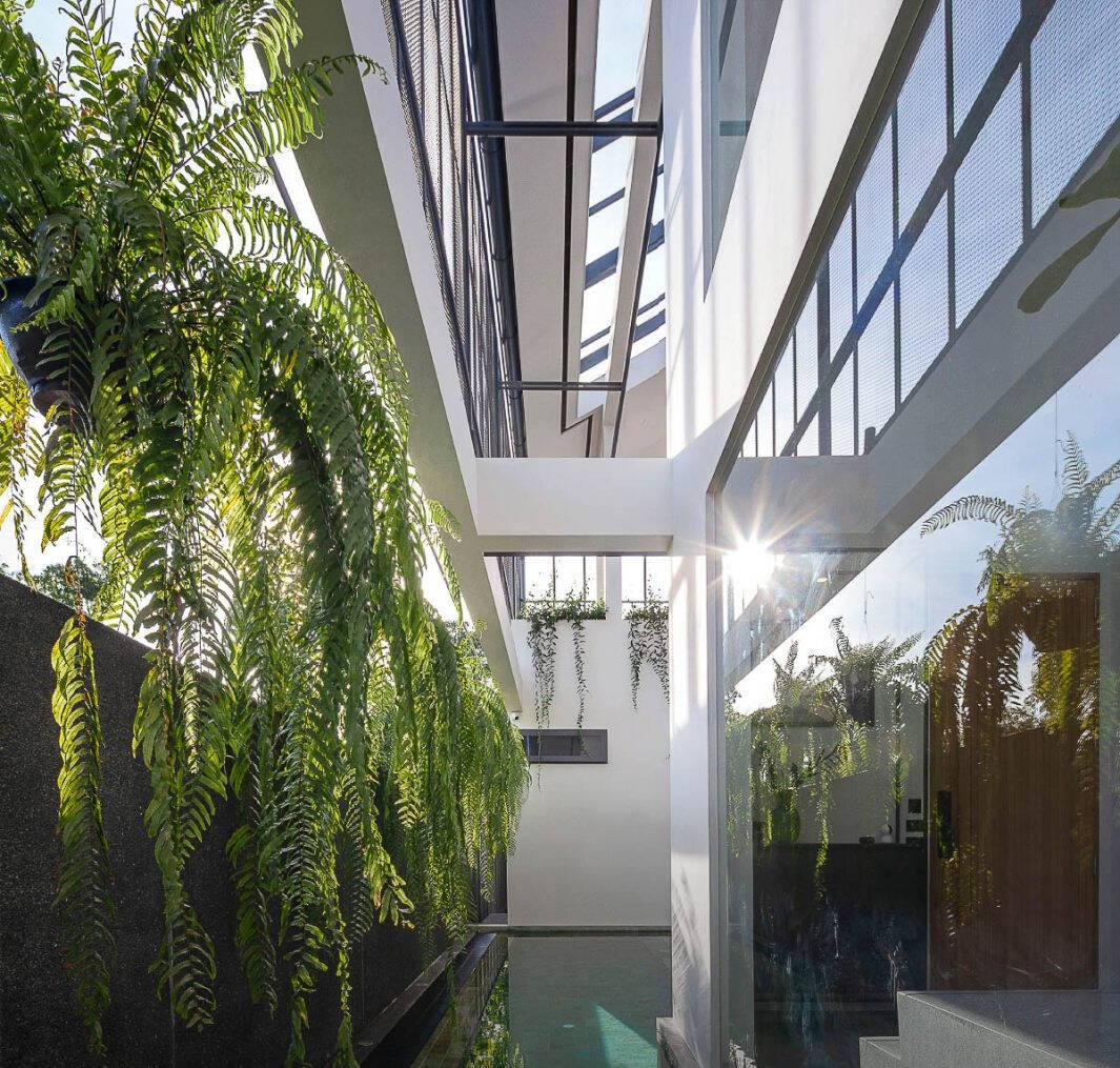 Ngôi nhà phố này nổi bật với thiết kế hiện đại, sử dụng toàn bộ mặt tiền bọc kính, giúp tối đa hóa ánh sáng tự nhiên và tạo cảm giác rộng mở. Điểm đặc biệt là việc tích hợp năm khu vườn xanh được bố trí xuyên suốt ngôi nhà. Sự kết hợp này giúp ngôi nhà đạt được sự cân bằng hoàn hảo giữa tiện nghi đô thị và hơi thở thiên nhiên.