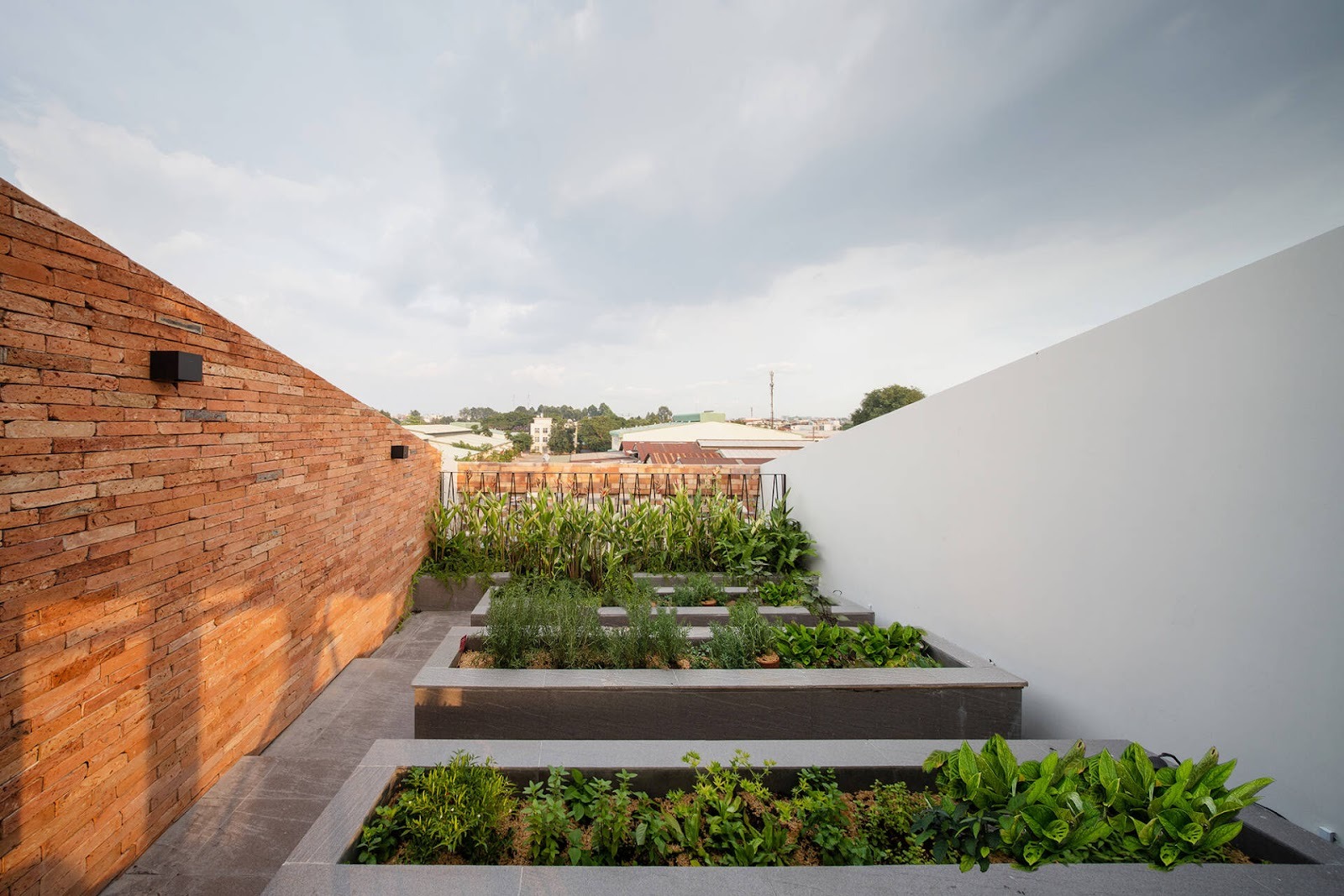 Mẫu nhà xanh nổi bật với mặt tiền hai lớp kết hợp gạch thô và mảng xanh. Thiết kế này giúp điều hòa tối ưu ánh sáng gió tự nhiên và giữ cho không gian luôn mát mẻ. Bên trong khoảng thông tầng kết hợp lam chắn đảm bảo ánh sáng lan tỏa khắp nhà. Đặc biệt vườn rau sạch trên mái không chỉ là cảnh quan thư thái mà còn cung cấp nguồn thực phẩm sạch cho gia chủ.
