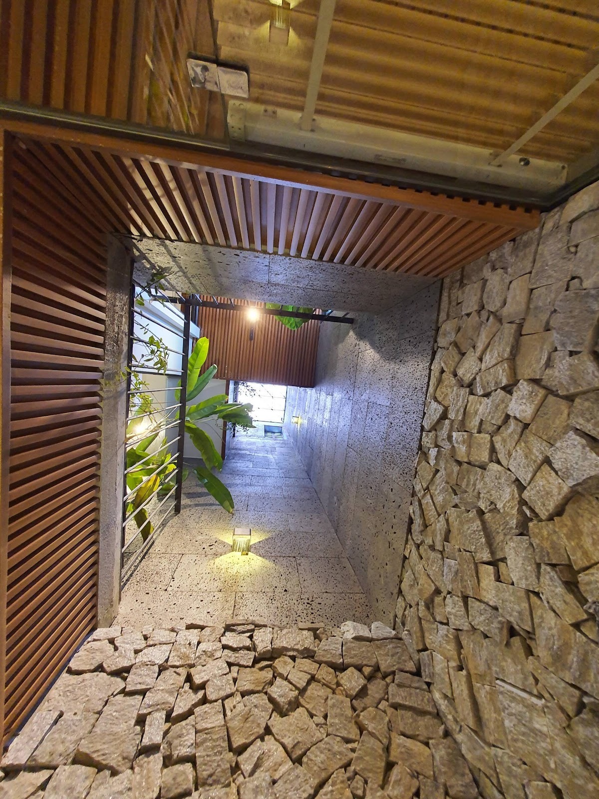 Hướng đến lối sống gần gũi thiên nhiên, ngôi nhà sử dụng vật liệu thân thiện như đá ong, gạch thẻ giả cổ và phủ xanh khắp các tầng. Lối vào mang vẻ hiện đại pha chút mộc mạc, mở ra không gian bên trong liền mạch với phòng khách - bếp thông suốt, cầu thang bay gỗ - kính nhẹ thoáng và giếng trời đón sáng, dẫn gió. Từng góc nhỏ đều ngập tràn sắc xanh, tạo nên một tổ ấm trong lành và ấm cúng.