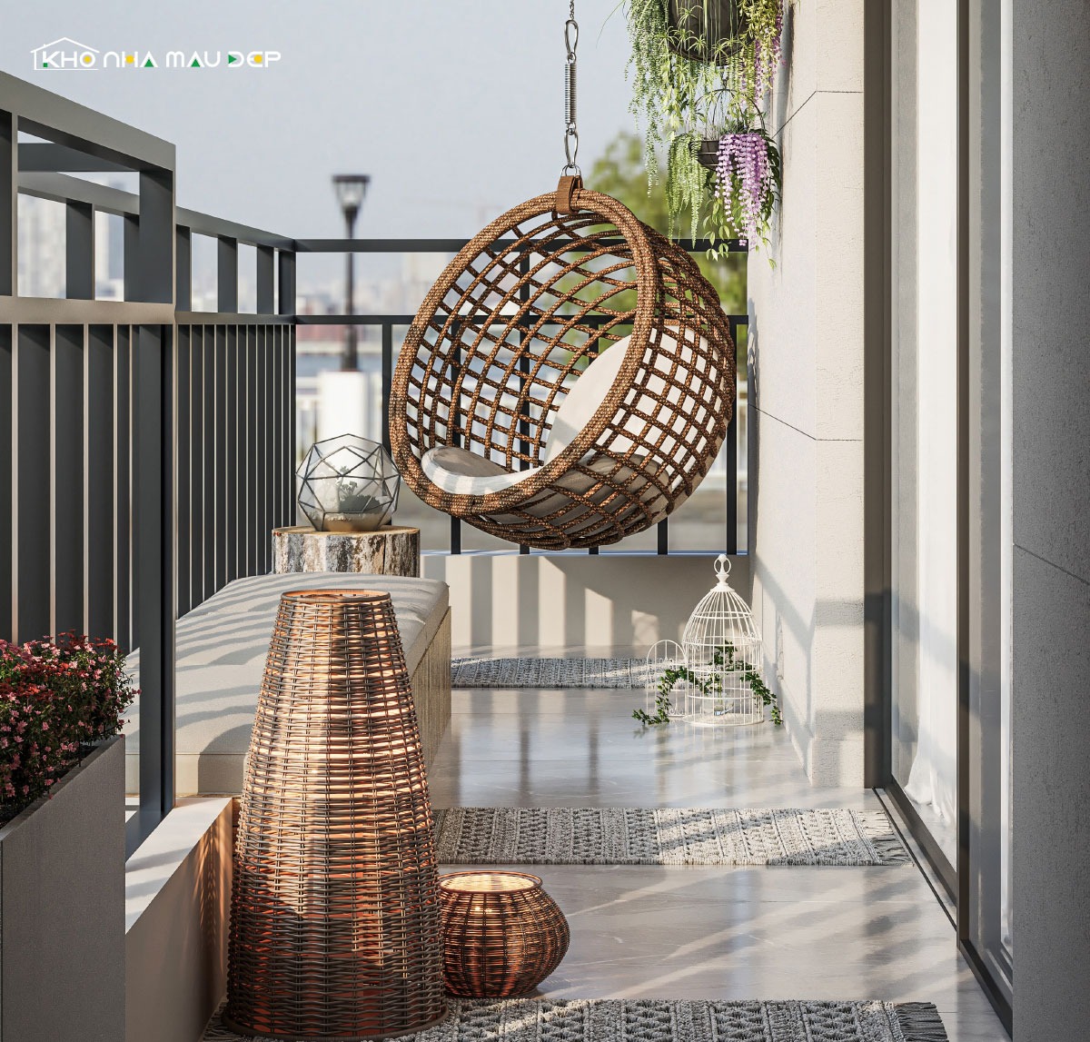 Ban công phong cách Bohemian mang đến không gian sắc màu, tự do và phóng khoáng. Thiết kế kết hợp nhiều gam màu rực rỡ, họa tiết độc đáo cùng đồ thủ công hoặc tái chế, tạo nên vẻ đẹp sinh động. Vật liệu chủ yếu gồm gỗ, mây, tre và vải, nội thất thường là thảm nhiều màu, gối tựa họa tiết, đèn lồng trang trí, mang đến cảm giác thư giãn và gần gũi. Ngoài ra, ban công có thể lắp mái che kéo dài để hạn chế nắng mưa, giúp không gian luôn thoải mái và bền đẹp.