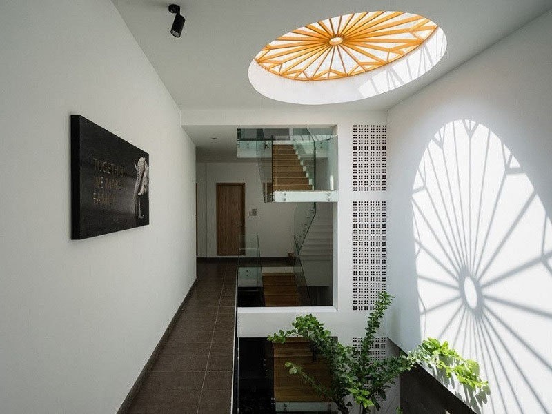 Họa tiết cánh hoa của thiết kế giếng trời cho nhà phố ấn tượng khi ánh nắng chiếu vào. Nguồn Enbasic.