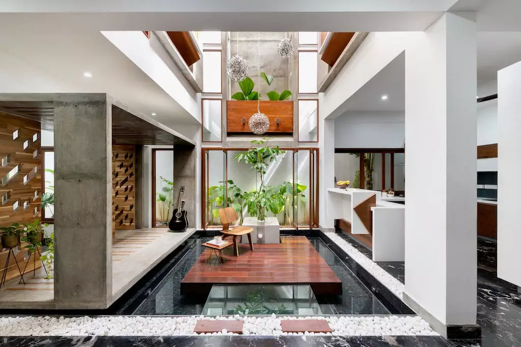 Giếng trời được thiết kế với bên dưới là một hồ cá và cây xanh tạo không gian cực kỳ mát mẻ. Nguồn Happy Nest.