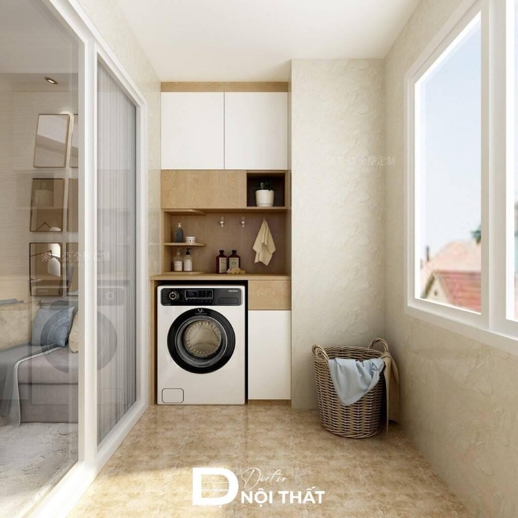 Đối với nhà phố có diện tích hạn chế, việc tận dụng ban công làm khu giặt phơi là giải pháp hiệu quả. Gia chủ có thể bố trí máy giặt, máy sấy và hệ thống giá phơi một cách gọn gàng, từ đó giúp tiết kiệm không gian nội thất. Khu vực này nên được che chắn bằng mái hiên, lam chắn hoặc kính cường lực để bảo vệ thiết bị và quần áo khỏi các yếu tố thời tiết, đồng thời vẫn phải duy trì được sự lưu thông không khí cần thiết.