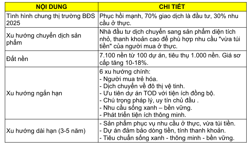 Theo DKRA, trong ngắn hạn, thị trường sẽ xoay quanh 6 xu hướng ngắn hạn: người mua ngày càng trẻ hóa; dịch chuyển mạnh về các đô thị vệ tinh; ưu tiên dự án TOD gắn liền với hạ tầng đồng bộ; chú trọng pháp lý và uy tín chủ đầu tư; gia tăng nhu cầu sống xanh và bền vững; và sự phát triển mạnh của tiện ích thông minh trong quản lý vận hành.