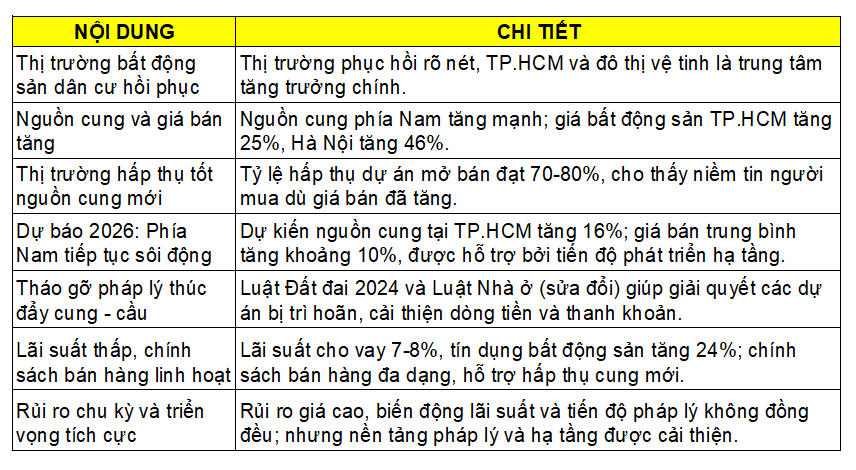 Tuy vậy, với nền tảng pháp lý ngày càng hoàn thiện, hạ tầng được đẩy mạnh đầu tư và chính sách vĩ mô theo hướng hỗ trợ tăng trưởng, thị trường bất động sản dân cư được kỳ vọng sẽ bước vào giai đoạn phục hồi bền vững hơn, trong đó khu vực phía Nam tiếp tục giữ vai trò đầu tàu dẫn dắt.
