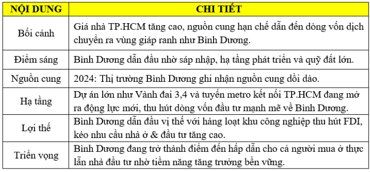 Bước sang năm 2025, thị trường Bình Dương tiếp tục được kỳ vọng sôi động hơn khi hàng loạt dự án mới được phê duyệt và triển khai. Yếu tố sáp nhập hành chính vào TP.HCM càng làm tăng thêm sức hút, bởi sự thay đổi về địa giới hành chính không chỉ giúp nâng cao vị thế của Bình Dương mà còn thúc đẩy dòng vốn đầu tư và gia tăng nhu cầu nhà ở trong khu vực.