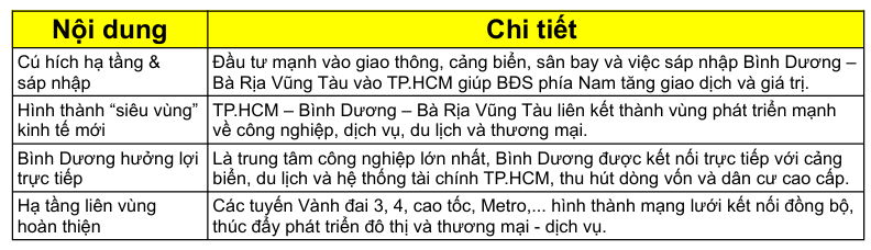 Việc đầu tư mạnh vào hạ tầng giao thông, cảng biển, sân bay cùng chủ trương sáp nhập Bình Dương và Bà Rịa - Vũng Tàu vào TP.HCM đã giúp thị trường bất động sản khu vực phía Nam hưởng lợi rõ rệt. Giao dịch, giá bán tăng mạnh, đặc biệt tại các khu vực có hạ tầng phát triển.