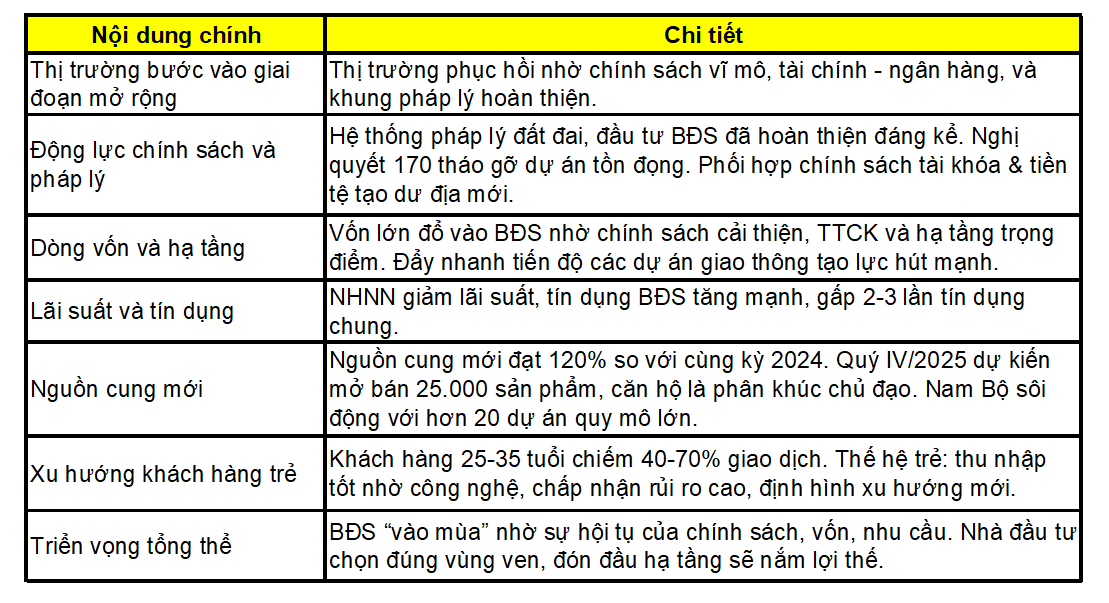 Viện Nghiên cứu bất động sản Đất Xanh Services nhận định, khu vực Nam Bộ sẽ trở nên đặc biệt sôi động với hơn 20 dự án quy mô dự kiến bung hàng trong giai đoạn cuối năm. Bà Trịnh Thị Kim Liên - Giám đốc Kinh doanh Đất Xanh khẳng định rằng "thị trường mùa gặt" đã đến khi các yếu tố lãi suất ổn định, vốn đầu tư công mạnh và dòng sản phẩm dồi dào cùng phát huy tác dụng. Bà đánh giá tâm lý người mua đã cải thiện rõ rệt, mở ra triển vọng phục hồi của thị trường. Đồng thời, sự bứt phá về hạ tầng giao thông tiếp tục mang lại lợi thế lớn cho các đô thị vệ tinh, nhất là khi nguồn cung tại các trung tâm lớn ngày càng khan hiếm và giá bị đẩy lên cao.