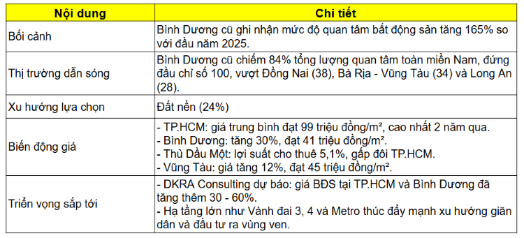 Theo báo cáo quý 3/2025 của Batdongsan.com.vn, sau khi sáp nhập vào TP.HCM, khu vực Bình Dương cũ ghi nhận mức độ quan tâm bất động sản tăng tới 165% so với đầu năm. Phân khúc căn hộ chung cư, nhà riêng, đất nền được đánh giá cao về tiềm năng tăng trưởng trong 6 tháng tới.