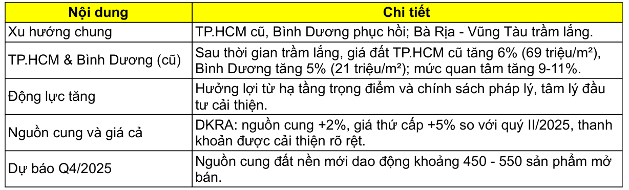 Thị trường đất nền quý III/2025 ghi nhận xu hướng phân hóa rõ rệt: đất nền tại TP.HCM cũ và Bình Dương đang có dấu hiệu phục hồi, Bà Rịa - Vũng Tàu vẫn duy trì trạng thái trầm lắng.