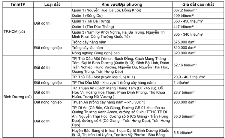 Tại TPHCM (cũ), theo bảng giá áp dụng đến hết ngày 31/12 năm nay, giá đất ở cao nhất đạt 687,2 triệu đồng/m² tại các tuyến đường Nguyễn Huệ, Lê Lợi, Đồng Khởi thuộc quận 1. Đây là mức giá cao gấp 4 lần so với bảng giá trước đây.