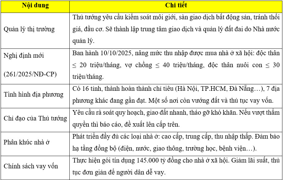 Chính phủ ban hành Nghị định 261/2025/NĐ-CP nâng trần thu nhập mua, thuê mua nhà ở xã hội lên 20-40 triệu đồng/tháng. Thủ tướng Phạm Minh Chính chỉ đạo các bộ, ngành khẩn trương hướng dẫn cụ thể, giám sát minh bạch thị trường bất động sản, thúc đẩy tín dụng 145.000 tỷ đồng hỗ trợ người dân.