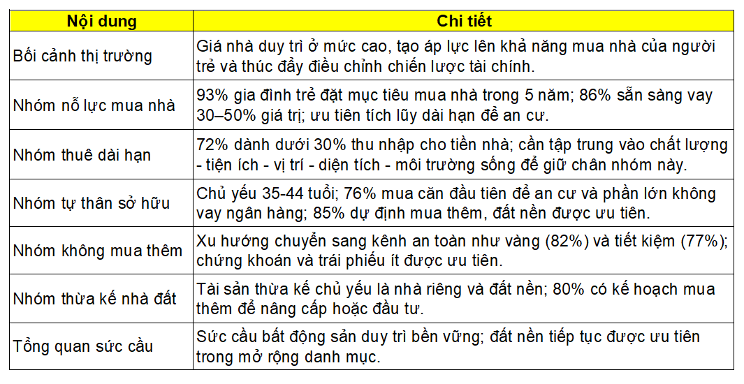 Khảo sát đối với nhóm người trẻ đã sở hữu bất động sản đầu tiên cho thấy một quá trình tích lũy tài chính bài bản và có định hướng rõ ràng. Nhóm này chủ yếu nằm trong độ tuổi 35-44 (75%), phần lớn đã lập gia đình và có con (88%). Ở giao dịch đầu tiên, 76% chọn mua để an cư và gần một nửa không cần vay ngân hàng nhờ chuẩn bị được nguồn vốn tự có.