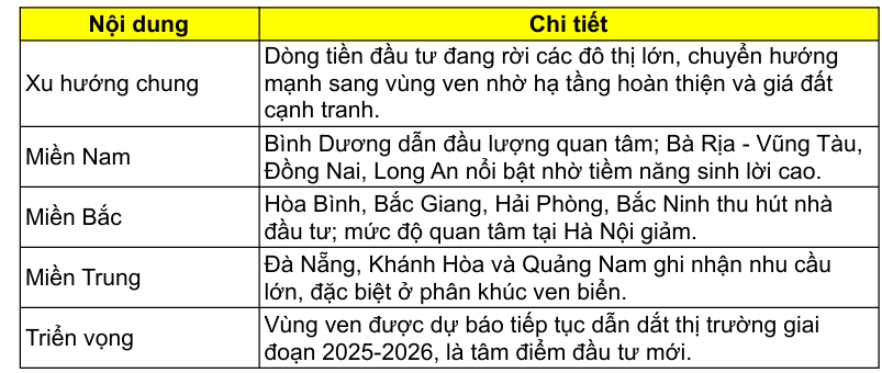 Thị trường bất động sản quý 3/2025 ghi nhận sự dịch chuyển rõ rệt của nhu cầu và dòng tiền từ trung tâm lớn Hà Nội và TP.HCM sang các vùng vệ tinh lân cận. Xu hướng này được thúc đẩy bởi tiềm năng tăng trưởng tại các khu vực ven đô và hệ thống hạ tầng liên vùng ngày càng hoàn thiện.