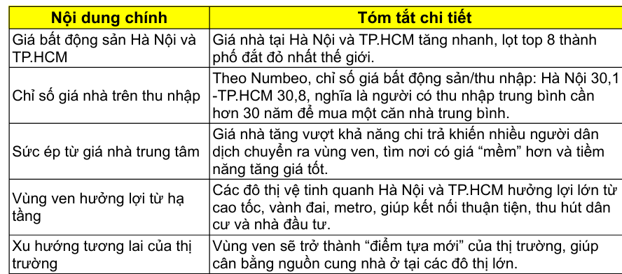 Trước bối cảnh giá nhà tại khu vực trung tâm Hà Nội và TP.HCM ngày càng tăng cao, xu hướng tìm kiếm đến bất động sản vùng ven đang được nhiều người quan tâm. Các khu vực ngoại thành với lợi thế quỹ đất rộng, mức giá dễ tiếp cận và hạ tầng ngày càng hoàn thiện đang trở thành lựa chọn thay thế phù hợp. Đặc biệt sau sáp nhập các hệ thống cao tốc, vành đai, tuyến metro được đẩy nhanh tiến độ, rút ngắn khoảng cách di chuyển, giúp kết nối vùng ven với trung tâm thuận tiện. Qua đó, vùng ven đang kỳ vọng sẽ giữ vai trò bổ trợ cho thị trường trung tâm vừa đáp ứng nhu cầu an cư thực tế, góp phần cân bằng nguồn cung nhà ở tại các đô thị lớn.