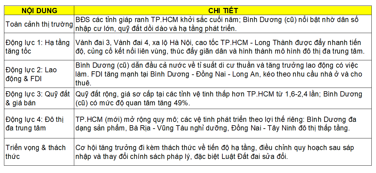 Giai đoạn cuối năm, bất động sản các tỉnh giáp ranh TP.HCM như Bình Dương, Đồng Nai, Long An và Bà Rịa - Vũng Tàu (tên gọi trước sáp nhập) ghi nhận tín hiệu khởi sắc, trong đó Bình Dương (cũ) nổi bật nhờ lợi thế dân số nhập cư lớn, quỹ đất dồi dào và hạ tầng giao thông ngày càng hoàn thiện.
