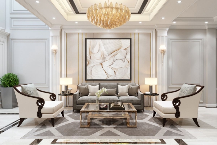 Nội thất chủ đạo là sofa bọc da cao cấp, bàn trà mặt đá granite, thảm trải sàn hoa văn cổ điển. Trần nhà trang trí phào chỉ tinh xảo, kết hợp đèn chùm pha lê tạo điểm nhấn lộng lẫy. Gam màu trắng - kem chủ đạo mang lại sự thoáng đãng, trong khi những chi tiết mạ ánh kim khẳng định vẻ sang trọng. Đây chính là nơi sum họp, tiếp khách, kết nối các thế hệ trong gia đình.