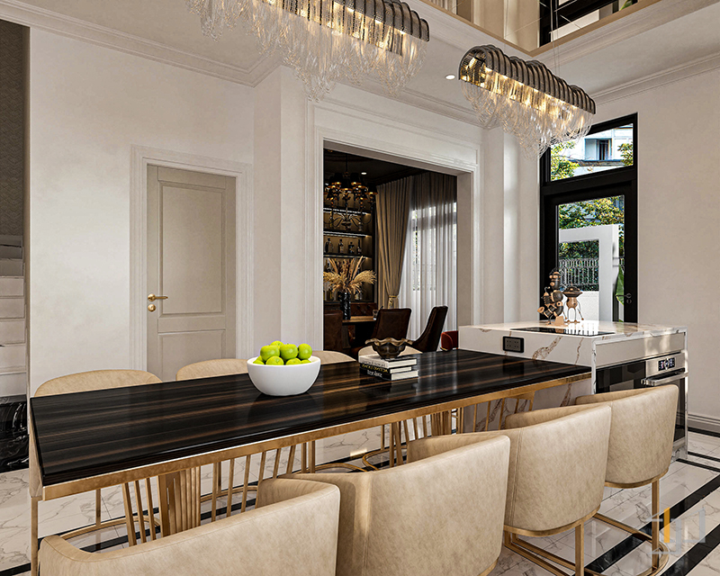 Phòng ăn liền kề phòng khách, sử dụng bàn dài bằng gỗ tự nhiên, ghế bọc da đồng bộ. Hệ tủ bếp gỗ sơn trắng kết hợp mặt bàn đá granite tạo cảm giác sạch sẽ, hiện đại nhưng vẫn cổ điển. Ánh sáng được bố trí khéo léo bằng đèn treo thả kiểu dáng cổ điển, tạo không khí ấm cúng cho những bữa cơm gia đình nhiều thế hệ.