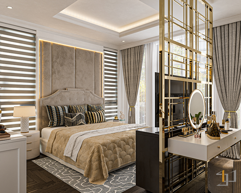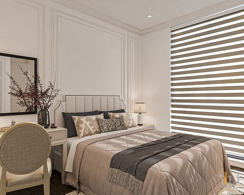 Phòng con cái: Không gian trẻ trung hơn, sử dụng điểm nhấn màu pastel hoặc xanh nhẹ, kết hợp cùng nội thất đồng bộ với kiến trúc tân cổ điển để giữ sự thống nhất tổng thể.