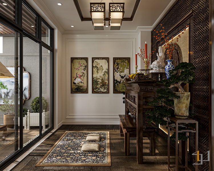 Phòng thờ thường đặt ở tầng cao nhất, tách biệt sinh hoạt chung để giữ sự thanh tịnh. Bố cục cân đối với bàn thờ gỗ tự nhiên chạm khắc tinh xảo, hai bên là câu đối, bình phong hoặc đèn thờ, tạo không gian uy nghi. Gam màu chủ đạo trầm ấm như nâu gỗ, vàng nhạt, kết hợp ánh sáng dịu từ đèn đồng và nến, mang lại vẻ trang nghiêm và thể hiện sự hiếu kính truyền thống.