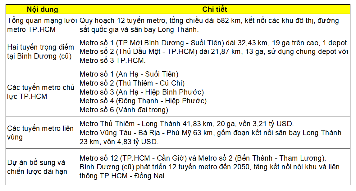 TP.HCM đặt mục tiêu triển khai 9 tuyến metro trước năm 2035, bao gồm 6 tuyến trung tâm, 2 tuyến nối Bình Dương (cũ) và 1 tuyến hướng Bà Rịa - Vũng Tàu (cũ). Mạng lưới này sẽ hình thành trục xương sống quan trọng cho giao thông công cộng vùng đô thị TP.HCM mở rộng.