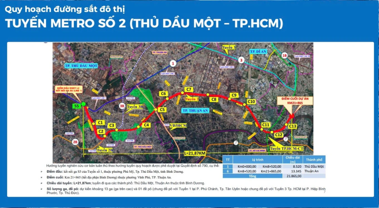 Tuyến Metro số 2 (Thủ Dầu Một - TP.HCM) có chiều dài 21,87 km, toàn tuyến chạy trên cao, xuất phát từ khu vực ga S5 của tuyến đường sắt đô thị số 1 (phường Phú Mỹ, TP.Thủ Dầu Một cũ), đi qua phường Bình Hòa và kết thúc tại phường Vĩnh Phú (TP.Thuận An cũ). Tuyến này sẽ là điểm nối với metro số 3 của TP.HCM tại khu vực Hiệp Bình Phước (cũ). Trên tuyến dự kiến 13 nhà ga trên cao và dùng chung depot với metro số 3 của TP.HCM.