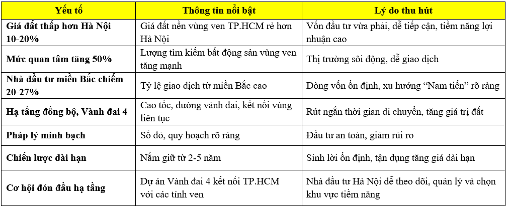 Trong bối cảnh bất động sản miền Bắc chững lại, nhiều nhà đầu tư từ Hà Nội đang “Nam tiến”, rót vốn vào đất nền vùng ven TP.HCM. Giá thấp hơn Hà Nội 10-20%, hạ tầng kết nối liên tục được nâng cấp và Dự án Vành đai 4 sắp hoàn thành mở ra cơ hội đón đầu tăng giá giúp nhà đầu tư vừa sinh lời vừa an toàn vốn.