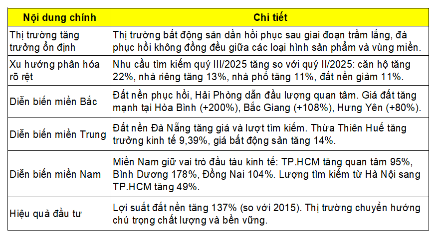 Các báo cáo khảo sát mới nhất cho thấy thị trường bất động sản đang từng bước quay lại nhịp tăng trưởng ổn định sau giai đoạn trầm lắng. Tuy nhiên, đà phục hồi không đồng đều khi mức tăng và diễn biến thị trường có sự phân hóa rõ rệt giữa từng loại hình sản phẩm và từng vùng miền.