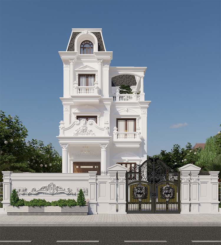 Ngôi nhà nổi bật với gam trắng chủ đạo kết hợp họa tiết khắc nổi đồng bộ, tạo ấn tượng thanh lịch ngay từ cái nhìn đầu tiên. Thiết kế mái vòm lợp gạch xen kẽ màu xám đen giúp tổng thể trở nên cao ráo và sang trọng. Kiến trúc không quá cầu kỳ, điểm xuyết bằng cột trụ sọc dọc đơn giản, chi tiết trang trí trắng tinh tế và ban công sắt đen nổi bật, mang đến mặt tiền cuốn hút. Sự kết hợp hài hòa giữa cột và tường cùng hoa văn đắp nổi trên vòm mái và đầu cột tạo nên vẻ đẹp tinh xảo, sang trọng mà vẫn giữ được sự tinh gọn, hiện đại.