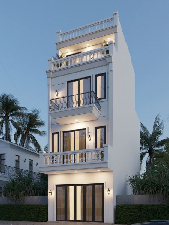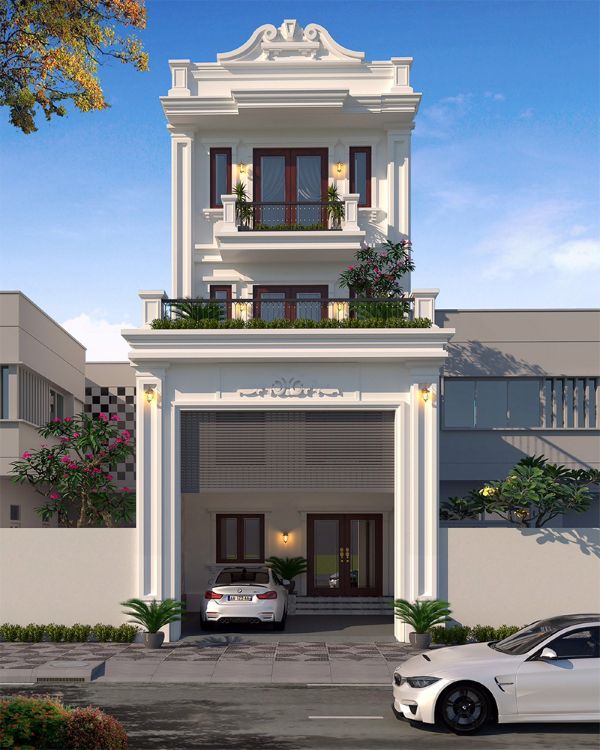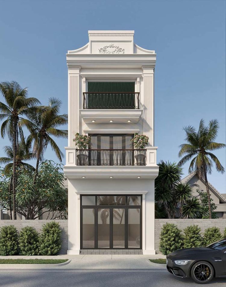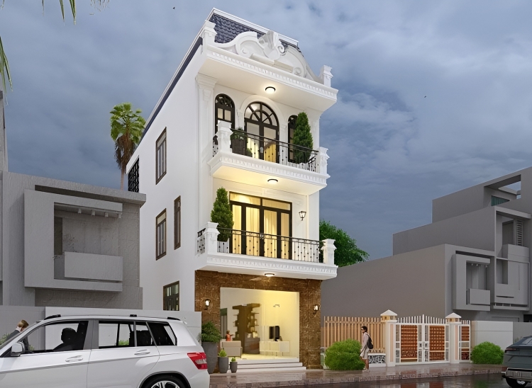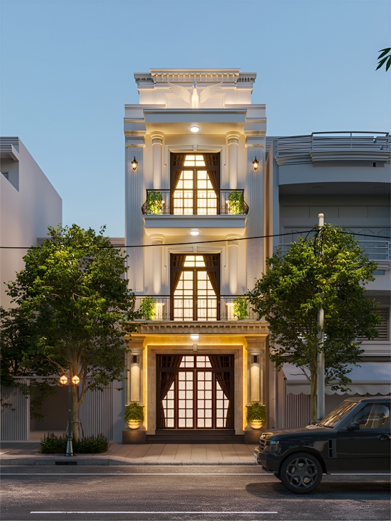 Đây là mẫu nhà được nhiều gia đình lựa chọn nhờ sự phù hợp với diện tích đất phổ biến tại đô thị. Dù chiều ngang hạn chế, kiến trúc vẫn hiện lên vẻ tinh tế và sang trọng. Điểm nhấn ngoại thất nằm ở hệ cột trụ, phào chỉ và hoa văn trang trí sắc sảo, gợi nét đẹp cổ điển đầy quý phái. Không gian bên trong được sắp xếp hợp lý, khai thác tối đa diện tích, mang lại sự tiện nghi, đồng thời khéo léo kết hợp giữa truyền thống và hiện đại, đem đến tổ ấm ấm cúng và thoải mái cho gia chủ.