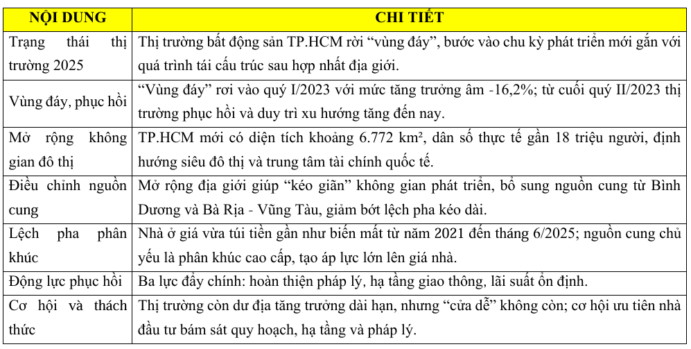 Sau giai đoạn trầm lắng và thanh lọc kéo dài, bất động sản TP.HCM năm 2025 đang đi vào chu kỳ phát triển mới. Sự phục hồi lần này không đơn thuần mang tính “quay lại quỹ đạo”, mà diễn ra song hành với quá trình tái cấu trúc thị trường sau hợp nhất địa giới, nguồn cung được bổ sung và không gian phát triển được mở rộng, tạo ra nền tảng cho một giai đoạn tăng trưởng mới.