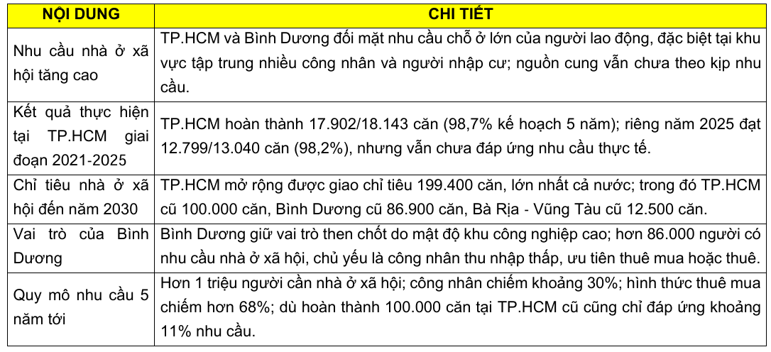 Trong tổng chỉ tiêu nhà ở xã hội đến năm 2030, khu vực Bình Dương cũ chỉ đứng sau TP.HCM cũ, phản ánh nhu cầu rất lớn tại địa phương có mật độ khu công nghiệp cao và lao động nhập cư đông. Theo Viện Nghiên cứu Phát triển TP.HCM, trong 5 năm tới, Bình Dương cũ có hơn 86.000 người cần nhà ở xã hội, chủ yếu là công nhân có khả năng tích lũy hạn chế, ưu tiên thuê mua hoặc thuê. Dù đã triển khai nhiều dự án, nguồn cung hiện vẫn chưa đáp ứng nhu cầu thực tế, khiến nhiều công nhân vẫn phải tiếp tục sống trong các khu nhà trọ tự phát, điều kiện hạ tầng và tiện ích còn hạn chế.
