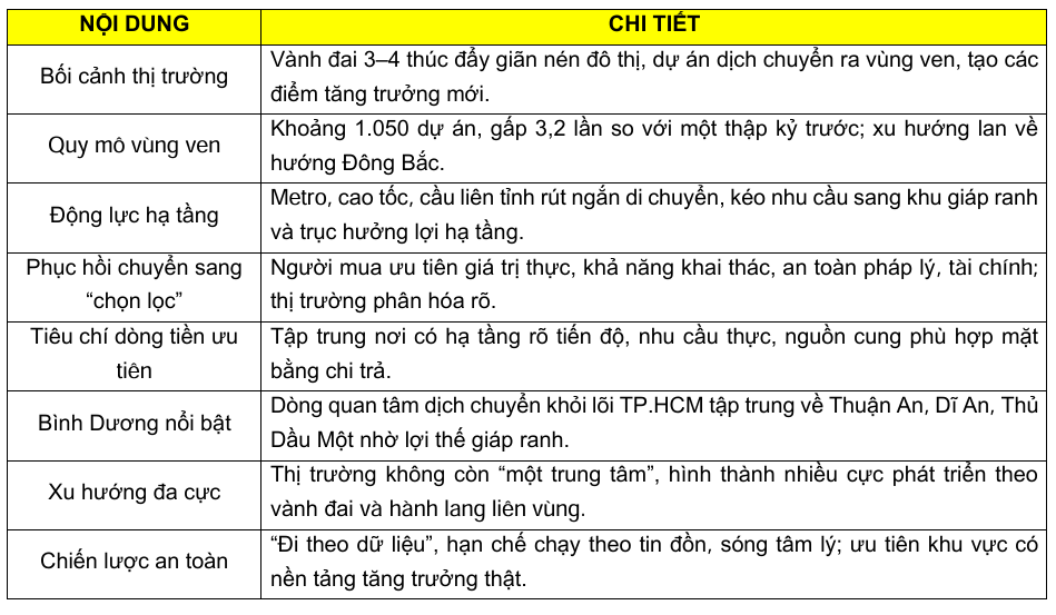 Thông điệp: hệ thống vành đai và các hành lang liên kết vùng đang tái định nghĩa thị trường TP.HCM không chỉ mở rộng không gian đô thị, mà còn “đổi hướng” dòng quan tâm sang các vùng giáp ranh, góp phần định hình mô hình thị trường đa cực thay vì chỉ xoay quanh trung tâm truyền thống.