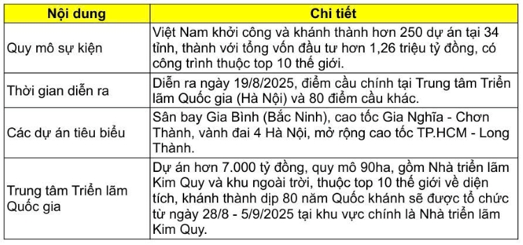 Trước đó, Thủ tướng đã chỉ đạo các tỉnh, thành phố và tập đoàn liên quan hoàn thiện thủ tục đầu tư, xây dựng, nghiệm thu để đảm bảo tiến độ, gửi Bộ Xây dựng trước ngày 13/8. Một số công trình hạ tầng dự kiến khởi công trong dịp này có sân bay Gia Bình (Bắc Ninh), cao tốc Gia Nghĩa - Chơn Thành, vành đai 4 Hà Nội, mở rộng cao tốc TP.HCM - Long Thành,...